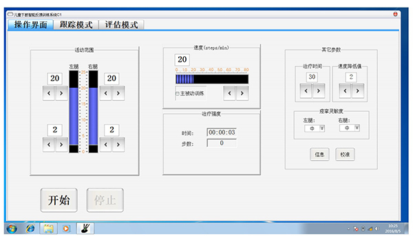 根據病人的自身情況(年齡、身高、體重、健康狀況等)設置係統參數,針對不同病情康複訓練治療,基本的參數有步幅,步頻,治療時間,痙攣靈敏度等;